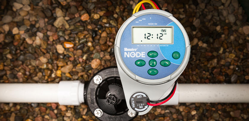 Para instalaciones aisladas, zonas con restricciones eléctricas o zonas de goteo con necesidades especiales, Node de Hunter es la solución inteligente y fiable. Se instala en el solenoide de una válvula de forma fácil y rápida, sin tornillos, taladros ni cables adicionales. Su sólida construcción y su exterior impermeable le permiten soportar los duros entornos de las arquetas de electroválvulas. Node se alimenta con una o dos pilas de 9 V que le proporcionan energía mas que suficiente a lo largo de toda la estación. Además de una fiabilidad excepcional, el Node se caracteriza por una pantalla LCD de fácil programación, la posibilidad de controlar una válvula maestra y el uso del lenguaje de programación estándar de los programadores Hunter, con 3 programas y 4 horas de inicio por programa. El abanico de opciones de programación y su gran fiabilidad hacen del Node un programador de riego compacto pero poderoso, con la flexibilidad de la alimentación a pilas.