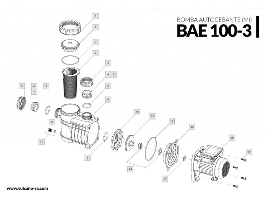 Bomba autocebante BAE 100-3 MI Vulcano de 1 HP de potencia y tensión trifásica de 220V/380V-50HZ. Cuerpo autocebante reforzado y prefiltro incorporado, conexiones con uniones dobles; con bujes de rosca hembra 1 ½” para caños de polipropileno y lisos de Ø 50 para pegar caños de PVC. Su buen desempeño, optimiza la circulación de agua convirtiéndola en una excelente opción para su pileta. Motor internacional.